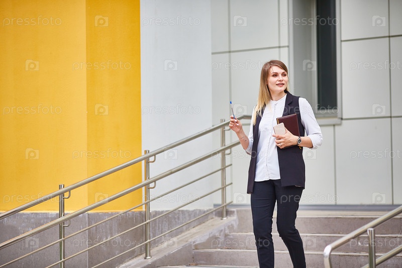 Девушка стоит на ступеньках здания. держит блокнот, телефон и ручку. Образование или бизнес-концепция