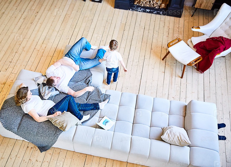Семья с маленьким ребенком отдыхает на огромном сером диване в гостиной. Образ жизни. Семейный образ в джинсах и белых футболках. Вид сверху