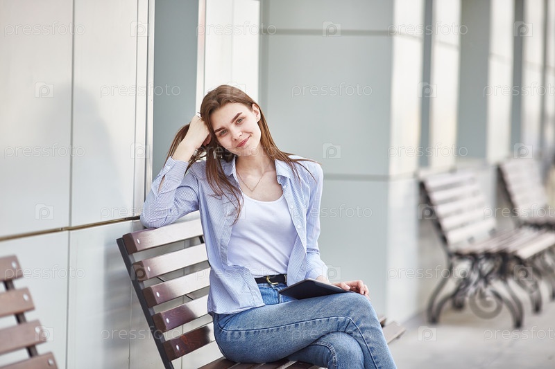 Молодая девушка сидит на скамейке с планшетом в руках и улыбается