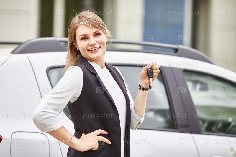 Портрет счастливой женщины-водителя, показывающей ключ от машины
