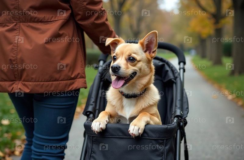 Женщина везет питомца в коляске, собака гуляет снаружи, сидя в саду. Генеративный искусственный интеллект