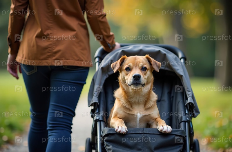 Женщина везет питомца в коляске, собака гуляет снаружи, сидя в саду. Генеративный искусственный интеллект