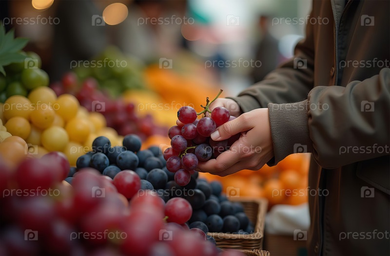 Женщина покупает виноград на рынке, руки крупным планом, фруктовый магазин. Генеративный искусственный интеллект
