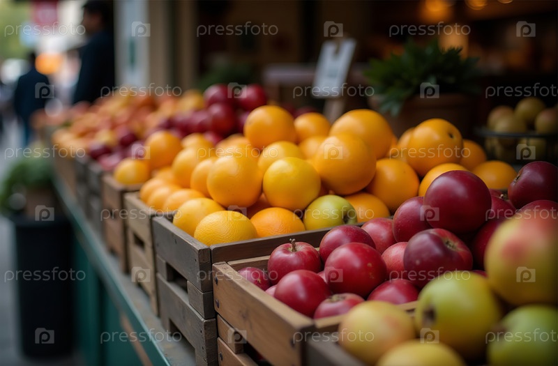 Фруктовый прилавок на рынке, фрукты в деревянных ящиках в магазине, торговый центр. Генеративный искусственный интеллект