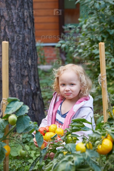 Маленькая девочка собирает помидоры в саду. Образ жизни