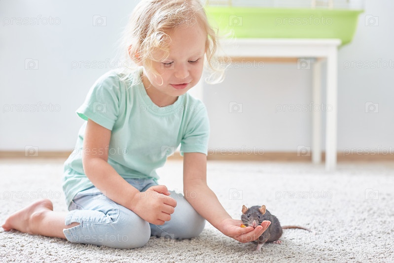 Черная крыса. Девочка играет с домашней черной крысой