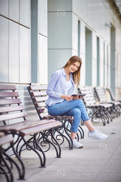 Молодая девушка сидит на скамейке с планшетом в руках и улыбается