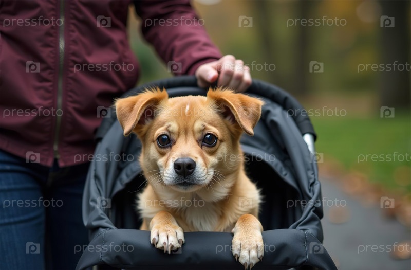 Женщина везет питомца в коляске, собака гуляет снаружи, сидя в саду. Генеративный искусственный интеллект