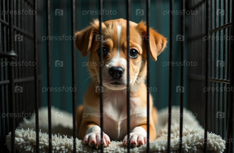 Маленькая собака сидит в клетке, щенок в будке, переноска для животных. Генеративный искусственный интеллект