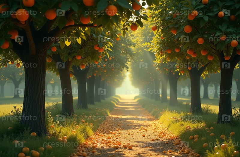 Большой сад апельсиновых фруктов, ферма, саженцы, растения, сладкие фрукты. Генеративный искусственный интеллект