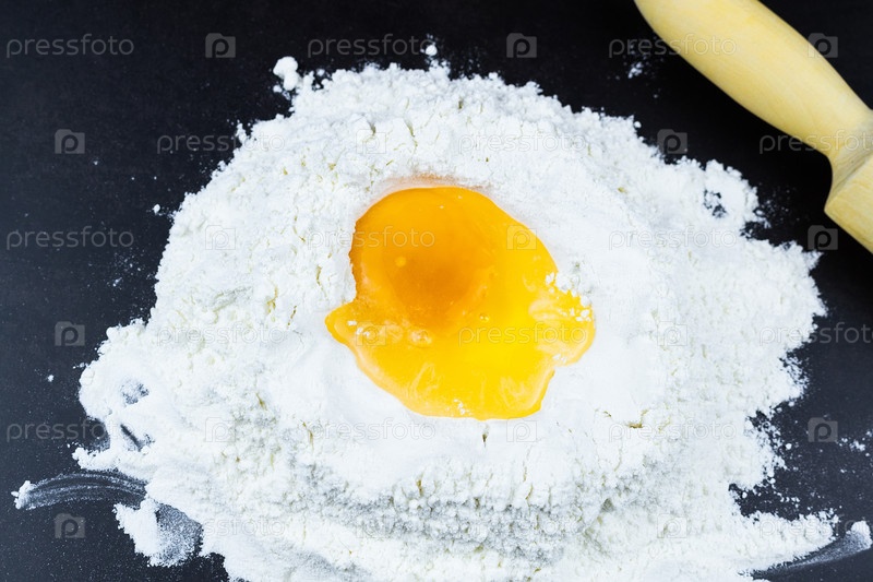 Мука и яйцо на черном фоне
