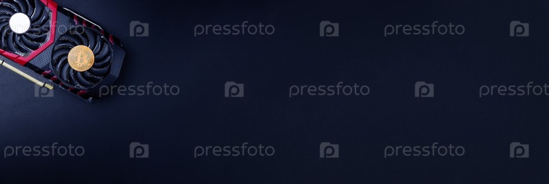 Концепция майнинга криптовалюты с золотыми монетами биткоин рядом с компьютером, производительная видеокарта, черный фон
