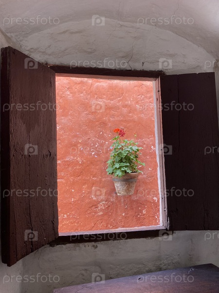 Герань к окне на красном фоне, Перу, Арекипа, Санта каталина