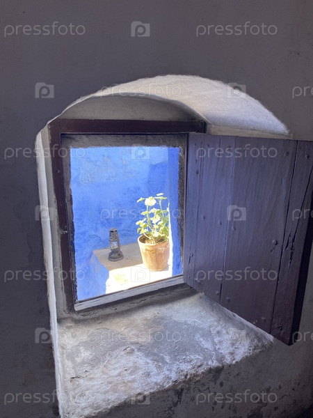 Герань в окне на синем фоне