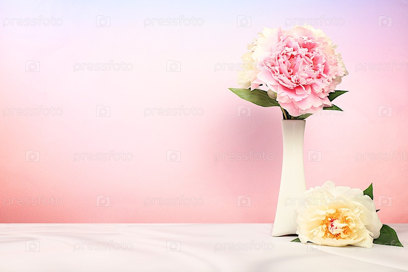 Абстрактная цветочная композиция, свежие пионы в вазе на солнечном фоне. Баннер для поздравлений с Днем матери, свадьбой, Женским днем, днем рождения. Минимальная современная эстетика, элегантная концепция красоты