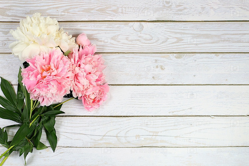 Букет свежих пионов на деревянном фоне.Абстрактная цветочная композиция.Баннер для поздравлений с Днем матери, свадьбой, Женским днем, днем рождения. Минимальная современная эстетика, элегантная концепция красоты