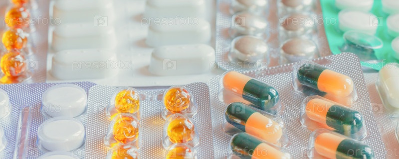 Куча разных медицинских таблеток и капсул, размытый фон