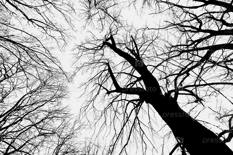 Черный силуэт ветвей большого дерева на белом фоне