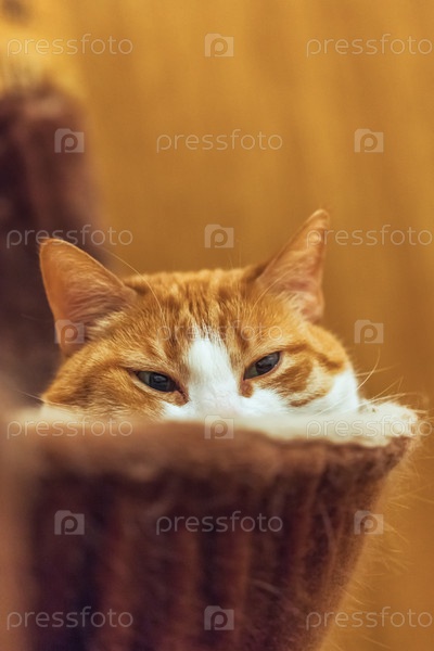 Ленивый рыжий кот лежит в кошачьем домике