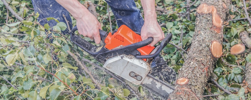 Мужчина с бензопилой пилит дерево, упавшее после урагана