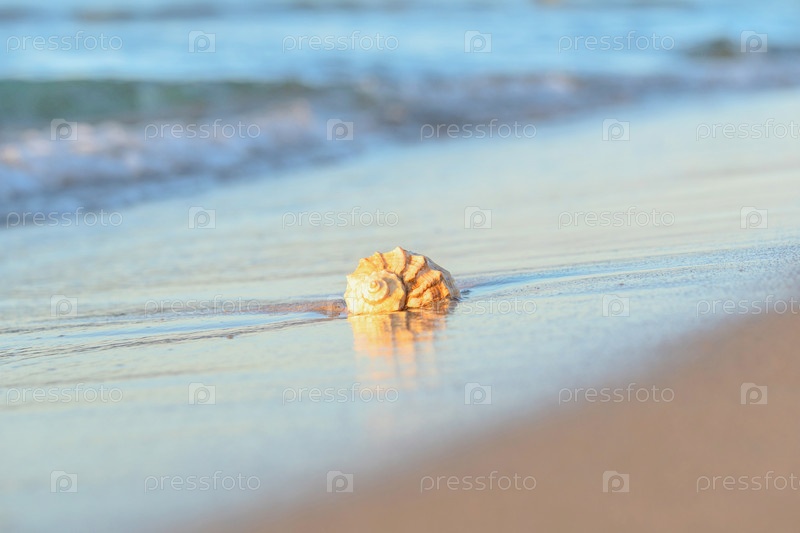 Красивая ракушка лежит на пляже, рядом с лазурной водой моря