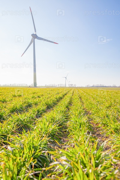Ветряная турбина на зеленом поле с солнечными бликами на фоне голубого неба