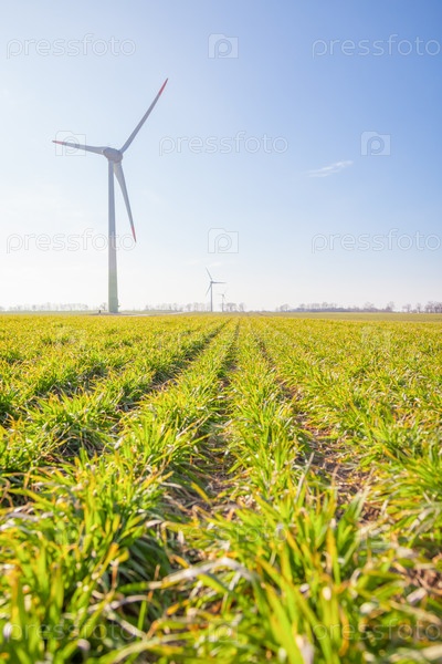 Ветряная турбина на зеленом поле с солнечными бликами на фоне голубого неба