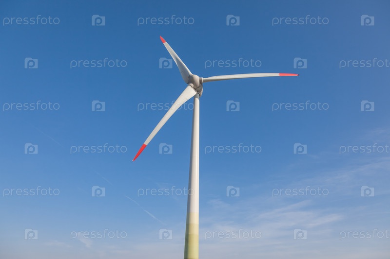 Ветряная турбина с солнечными бликами на фоне голубого неба, вид снизу