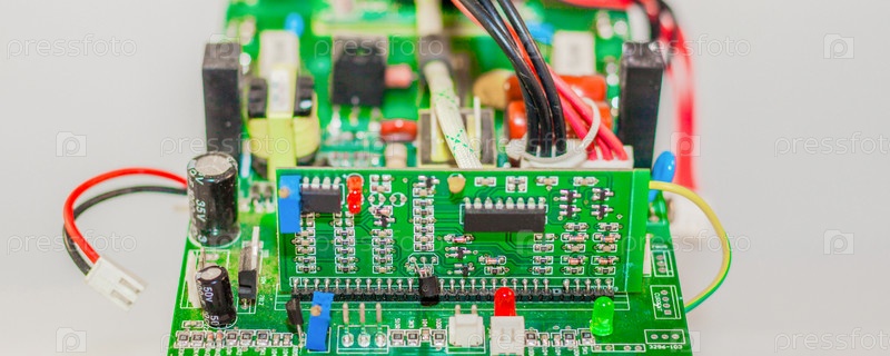Электрическая плата с электронными компонентами, крупный план размытого фона