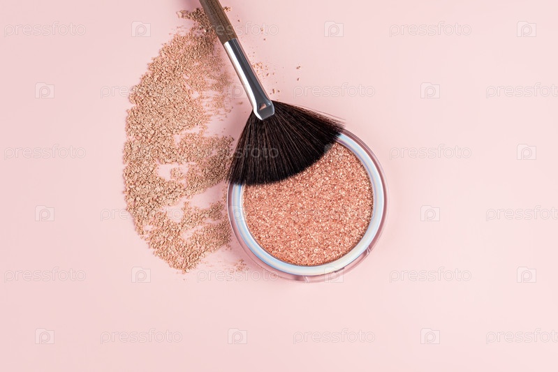 Круглая косметическая упаковка с шикарным хайлайтером естественного блеска. Веерная профессиональная кисть для макияжа. Вид сверху. молодость и красота кожи