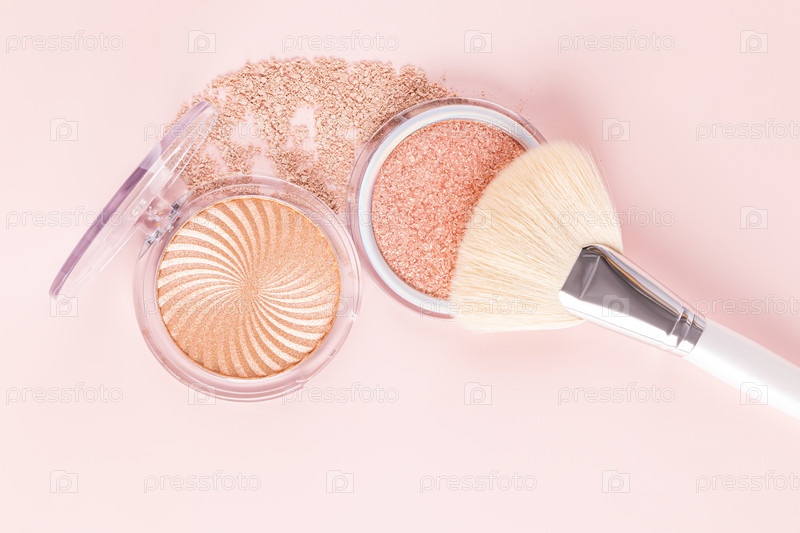 Шикарная большая профессиональная веерная кисть для макияжа лежит на открытой упаковке блестящего хайлайтера. Блеск и красота вечернего макияжа