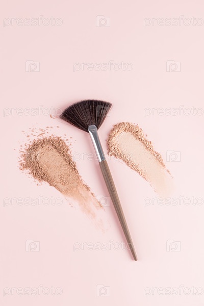 Два косметических мазка блестящей текстуры хайлайтера на пастельном вертикальном фоне профессиональной веерной кистью. вид сверху. Концепция красоты