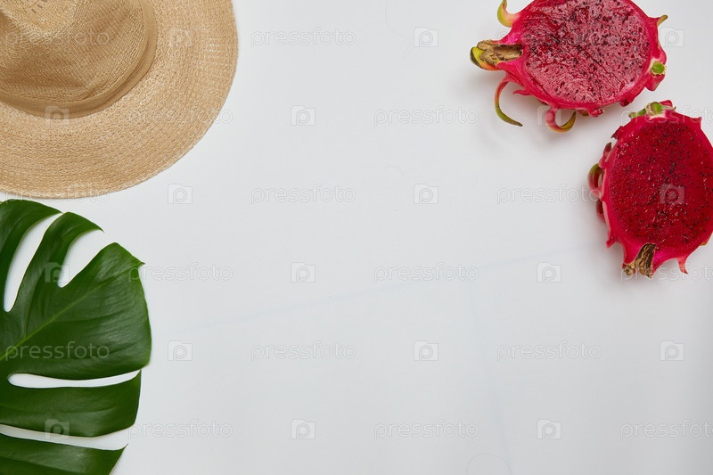 Концепция отдыха во время коронавируса. Драконий фрукт, шляпа и лист монстеры с копией пространства. Плоская планировка