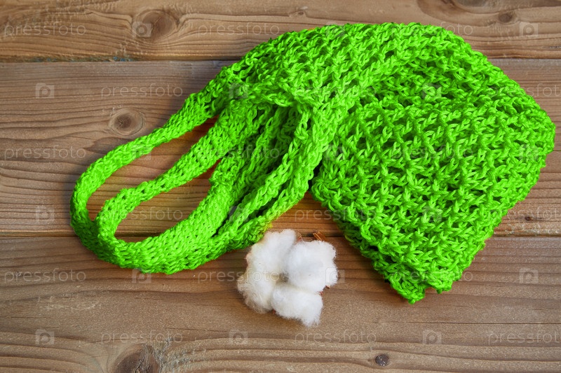 Зеленая авоська и коробочка хлопка лежат на деревянном коричневом фоне