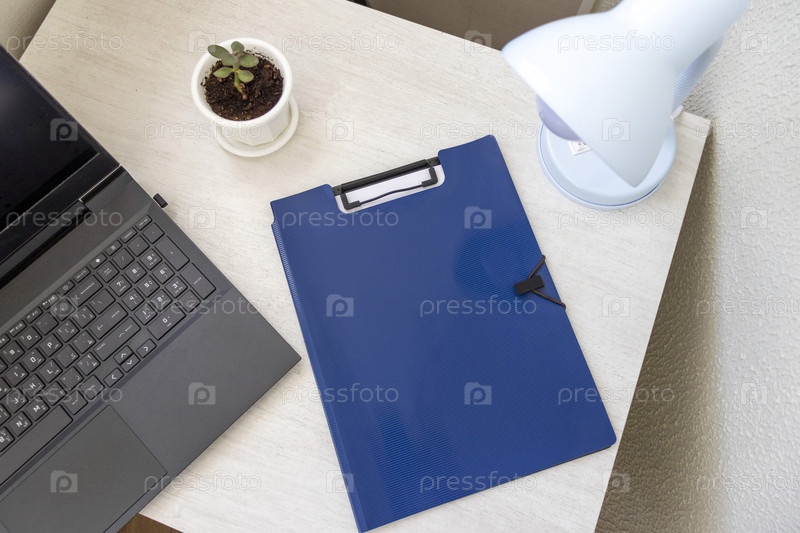 Снимок пластиковой папки на офисном столе с держателем для скрепок наверху и другими офисными принадлежностями. Макет бумаги формата А4. Канцелярские принадлежности