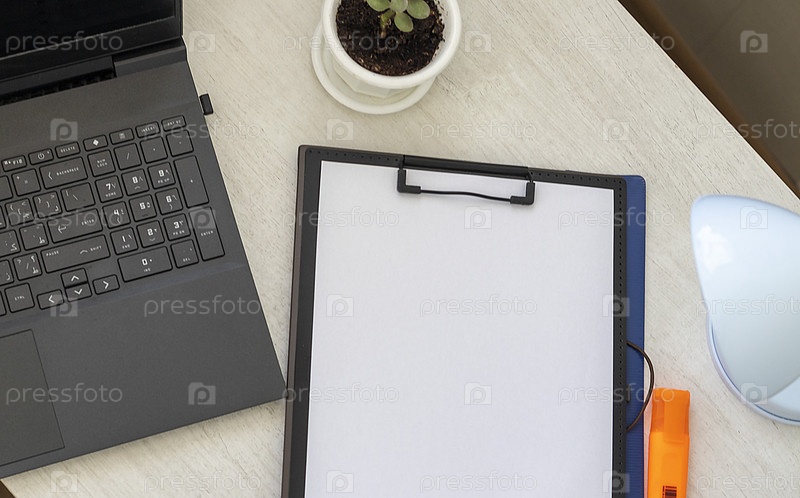 Снимок пластиковой папки на офисном столе с держателем для скрепок наверху и другими офисными принадлежностями. Макет бумаги формата А4. Канцелярские принадлежности