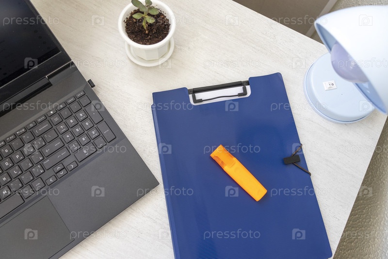 Снимок пластиковой папки на офисном столе с держателем для скрепок наверху и другими офисными принадлежностями. Макет бумаги формата А4. Канцелярские принадлежности