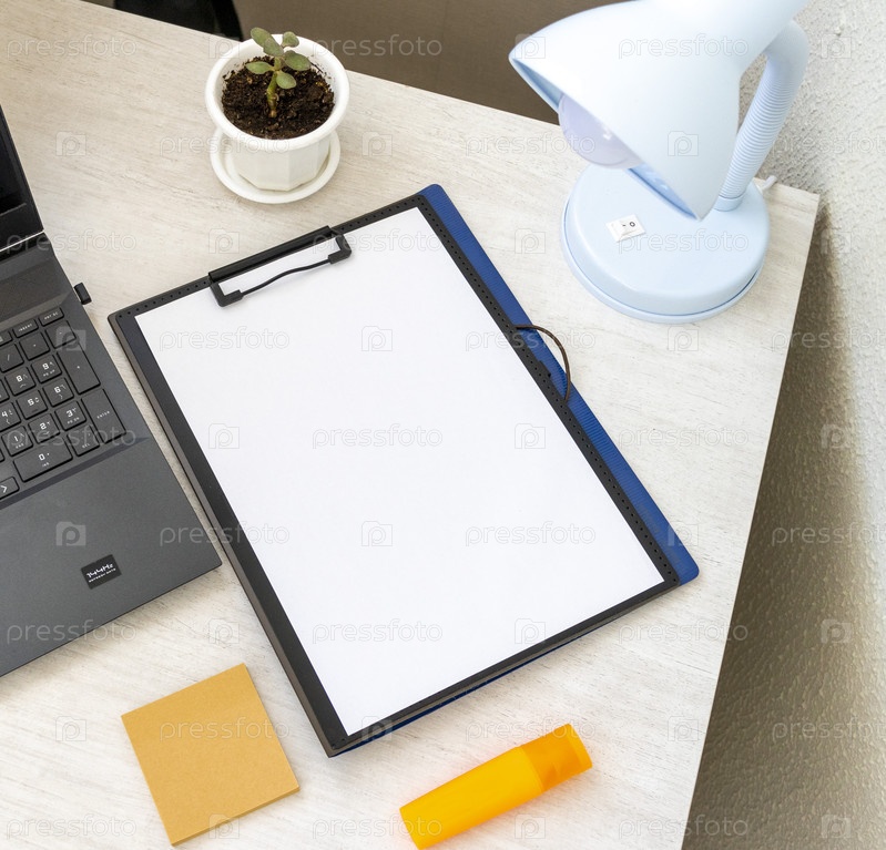 Снимок пластиковой папки на офисном столе с держателем для скрепок наверху и другими офисными принадлежностями. Макет бумаги формата А4. Канцелярские принадлежности