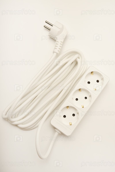 Удлинитель с тремя розетками. Белый провод с розетками на белом фоне