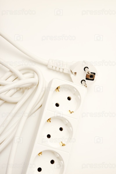 Удлинитель с тремя розетками. Белый провод с розетками на белом фоне