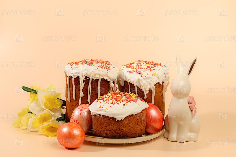 Концепция счастливой Пасхи. Абстрактная пасхальная композиция, фон. Праздничная открытка с традиционным русским куличом с безе и украшенным разноцветными мраморными яйцами. Подготовка к празднику