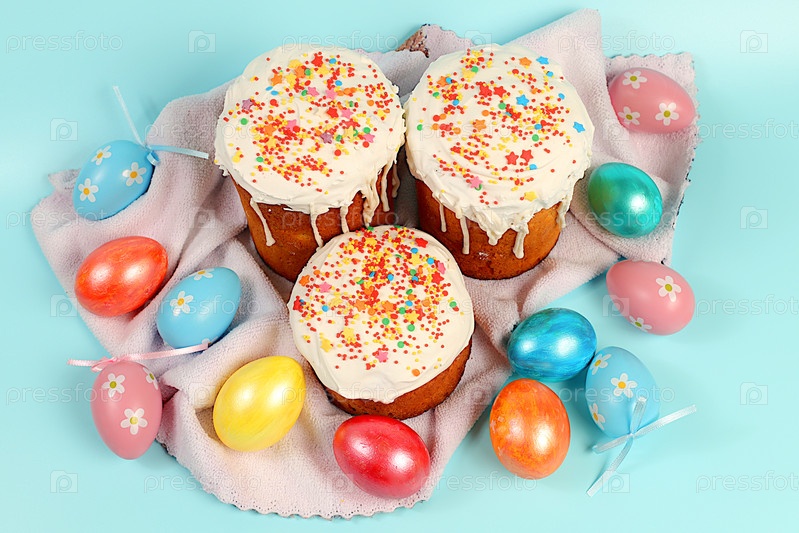 Абстрактная пасхальная композиция, фон. Праздничная открытка с традиционным русским куличом с безе и украшенным разноцветными мраморными яйцами. Подготовка к празднику и концепция счастливой Пасхи