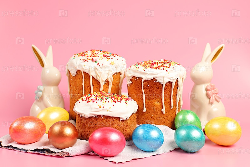 Концепция счастливой Пасхи. Абстрактная пасхальная композиция, фон. Праздничная открытка с традиционным русским куличом с безе и украшенным разноцветными мраморными яйцами. Подготовка к празднику и баннер