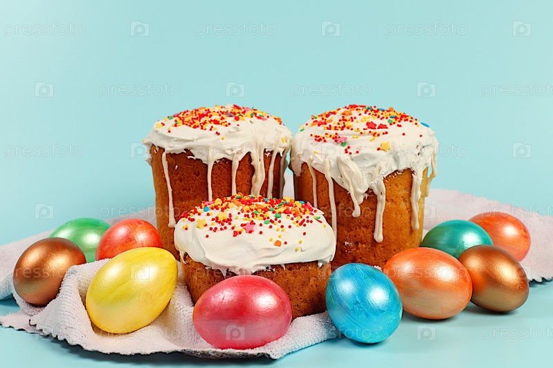 Праздничная пасхальная открытка с традиционным русским куличом с безе и украшенными разноцветными мраморными яйцами. Подготовка к празднику и концепция счастливой Пасхи. Баннер для экрана,