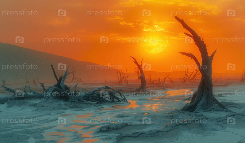 Пустыня с мертвыми деревьями на фоне драматического красного неба