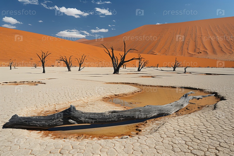 Мертвые деревья в пустынном глинистом плато на фоне песчаных дюн