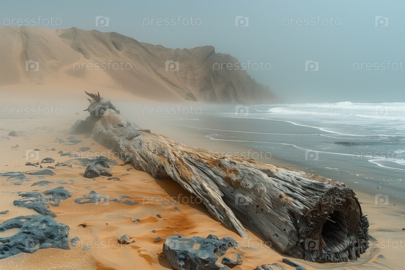 Мертвый ствол дерева на туманном пляже на рассвете, пустыня Намиб, Намибия