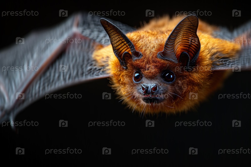 Летучая мышь в полете крупным планом на черном ночном фоне