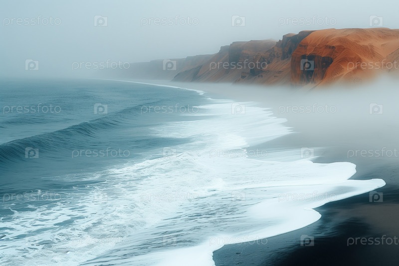 Вид с воздуха на морской прибой на туманном берегу, где встречаются пустыня и океан