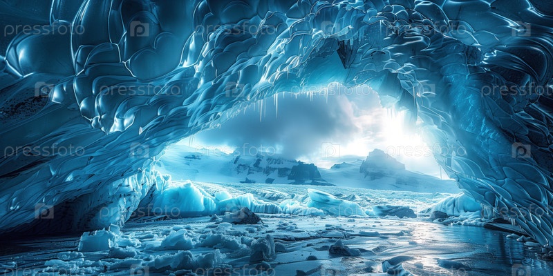 Прекрасный вид изнутри ледниковой пещеры в горах